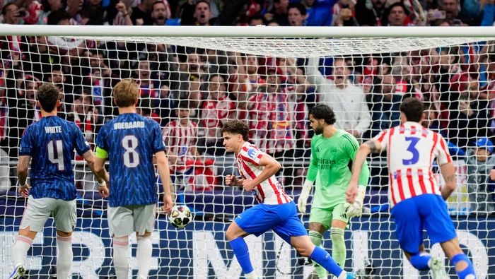 El partido comenzó con el Atlético presionando alto y un David Raya estelar que le negó el gol a Julián Álvarez apenas al minuto 13 tras un potente disparo desde la frontal. Sin embargo, el Arsenal, fiel a su estilo paciente, fue ganando terreno.