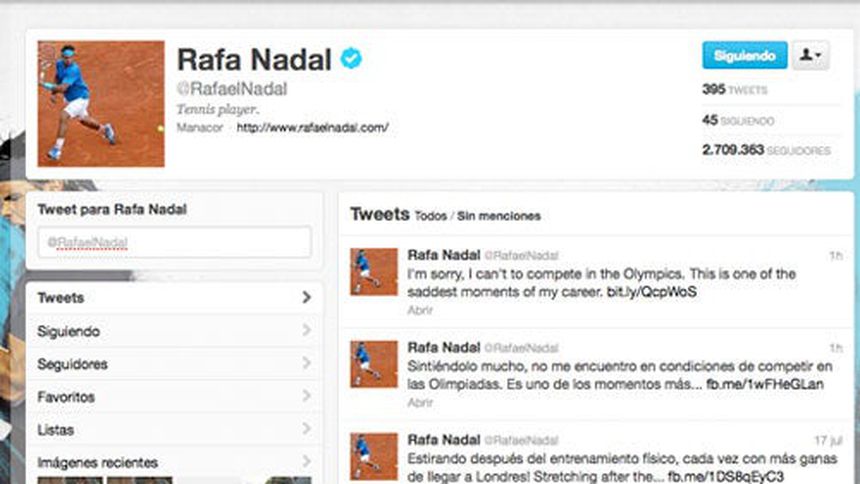 El tenista mallorquín Rafael Nadal publicó por medio de su cuenta de Twitter (@RafaelNadal), su pesar por no poder formar parte de la delagación que viajará a Londres.