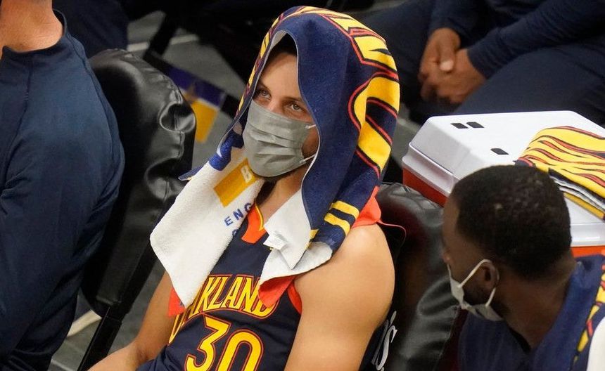 Steph Curry usa cubrebocas en la banca de Warriors | AP