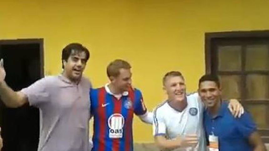 Manuel Neuer y Bastian Schweinsteiger aprovecharon su tiempo libre para divertirse junto a algunos aficionados del club brasileño de Salvador de Bahía, donde la selección de Alemania se concentra para el Mundial.