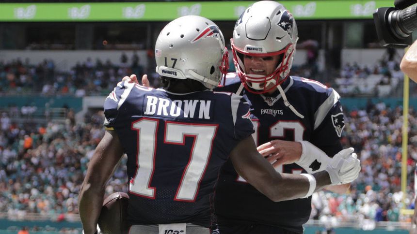 Antonio Brown consiguió una recepción de touchdown de 20 yardas en su debut con los New England Patriots, que lograron dos devoluciones de intercepción hasta las diagonales en un lapso de dos minutos del cuarto periodo para triturar el domingo 43-0 a los Miami Dolphins.