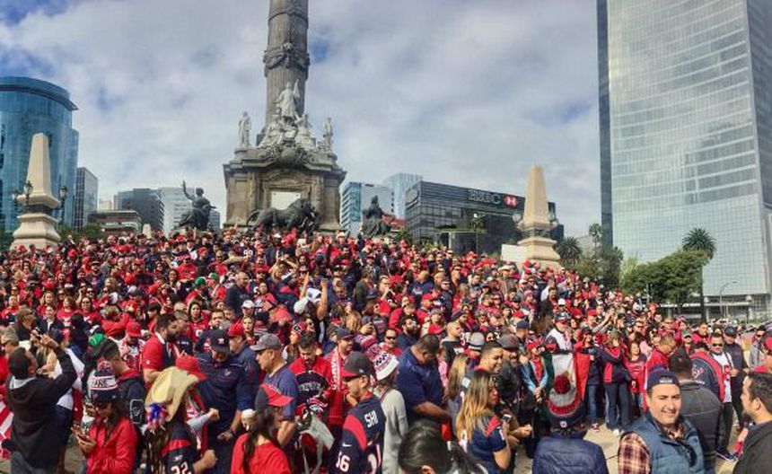 Para empezar a calentar el duelo, los fans de Texans se congregaron esta mañana en el Monumento a la Independencia para tomarse la foto del recuerdo. Con el grito "Texans, Houston" estalló el animo en el Ángel.