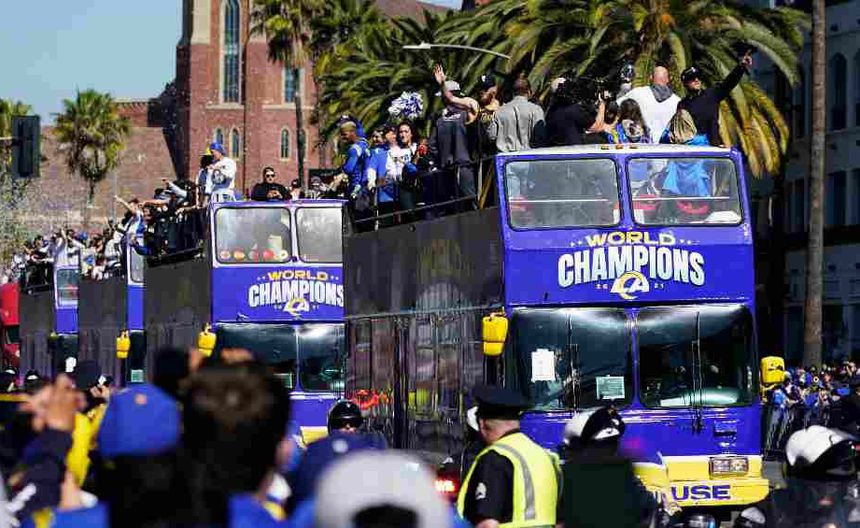Un autobús descubierto recorrió las calles de Los Ángeles y terminó frente al Memorial Coliseum, antiguo estadio de los Rams.