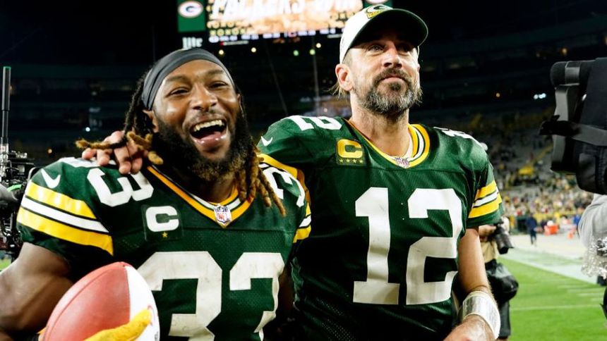 Aaron Rodgers y Aaron Jones tras un partido de los Packers | AP