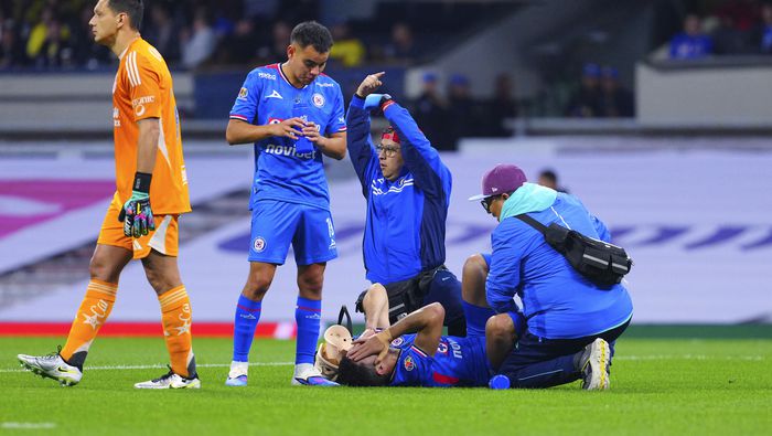 La escena generó mayor inquietud cuando el arquero azulcrema Rodolfo Cota también se aproximó para auxiliar y, con gestos, indicó una posible lesión de tobillo.