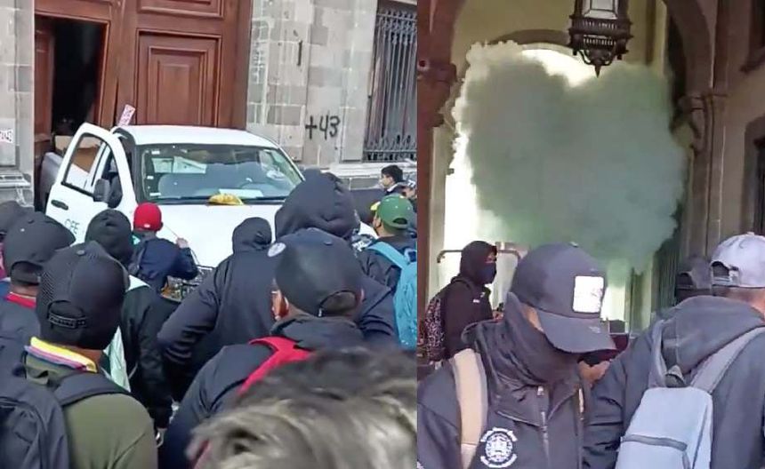 Después de derribar la puerta con una camioneta secuestrada de la Comisión Federal de Electricidad, los normalistas ingresaron a Palacio Nacional, elementos de la Guardia Nacional los replegaron con el uso de gas lacrimógeno, logrando controlar la situación y resguardando la seguridad del presidente López Obrador, quien pese a la violencia que mostraron los manifestantes, él siguió dando su conferencia.