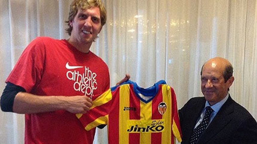El veterano jugador alemán de los Mavericks de Dallas, Dirk Nowitzki, recibió como regalo del Valencia la playera que el equipo naranjero utilizó en el encuentro ante el Bayern Munich en la primera jornada de la UEFA Champions League.
