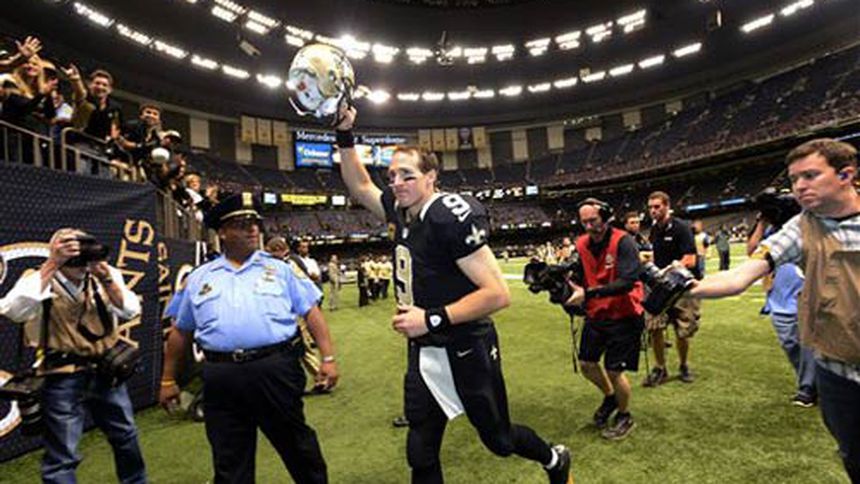 Brees completó 21 de los 27 pases que realizó para una ganancia de 239 yardas y no sufrió intercepciones. Los pases de touchdown que logró en este partido fueron en el segundo cuarto, al hallar en envío de una yarda con su receptor abierto Marques Colston, y en el último periodo, en pase de seis yardas a su ala cerrada Jimmy Graham.