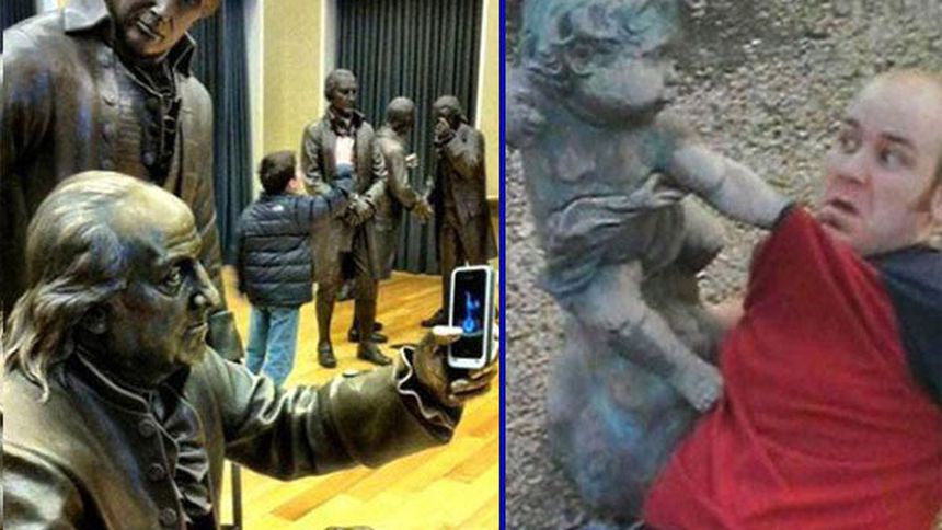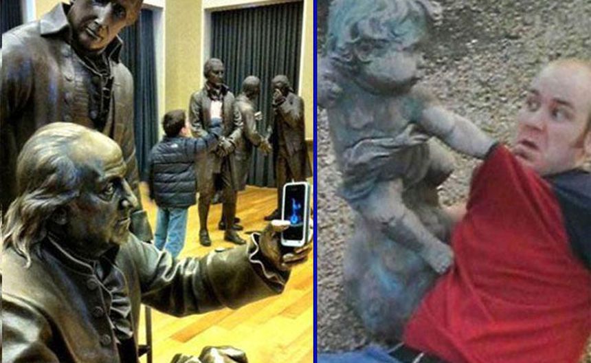 Posando con las monumentales obras de arte, usuarios de Internet han compartido en redes sociales las divertidas imágenes.