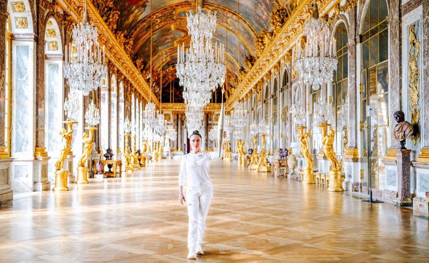 La estrella de Hollywood realizó su recorrido frente al majestuoso Palacio de Versalles, donde recibió la antorcha de la competidora ecuestre Laure Guilhaume. El momento fue capturado por la cuenta oficial de Paris 2024, que compartió una imagen de Hayek sosteniendo la antorcha dentro del histórico palacio.