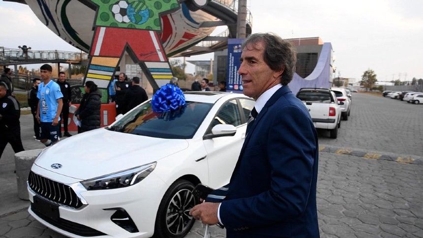 Jesús Martínez, CEO del Grupo Pachuca, entregó las llaves del nuevo coche al estratega de los Tuzos. El auto es de la marca JAC Motors, es de color blanco, adornado con un moño azul.