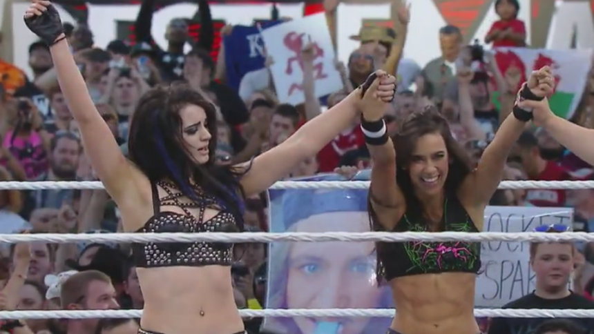 Paige y AJ levantan la mano luego de derrotar a la gemela Bella | WWE