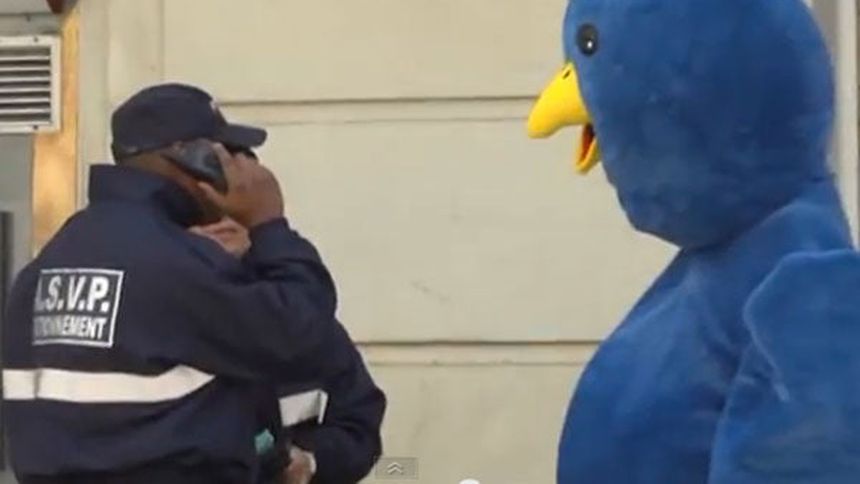 La botarga de uno de los símbolos más importantes en las redes sociales salió a las calles para hacer su labor de manera física, por lo que en el video se puede ver al pájaro azul ';siguiendo'; personas.