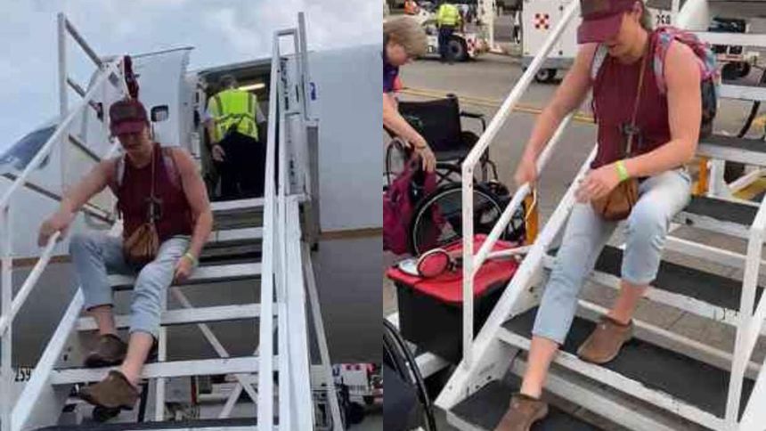 Así, sin ayuda del personal ni una opción viable para utilizar la silla, la para atleta llegó hasta abajo, donde le esperaban dos trabajadores aeroportuarios para ayudarle a sentarse en su silla de ruedas.