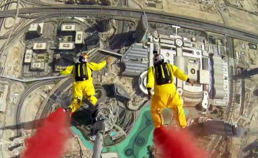 Los saltadores veteranos, Fred Fugen y Vince Reffet, rompieron el récord de altura, al lanzarse desde la torre más alta del mundo, el edificio Burj Khalifa de Dubai.