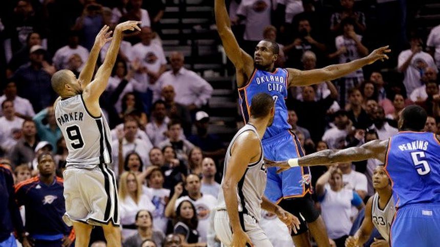 Parker anotó los últimos 14 puntos pese al constante acoso de Serge Ibaka, el líder bloqueador de tiros de la NBA en la campaña anterior. El base estelar convirtió tranquilamente el prolongado tiro desde la banda izquierda para luego lanzar un largo grito de emoción mientras sus compañeros lo rodeaban frente a la banca del Thunder.