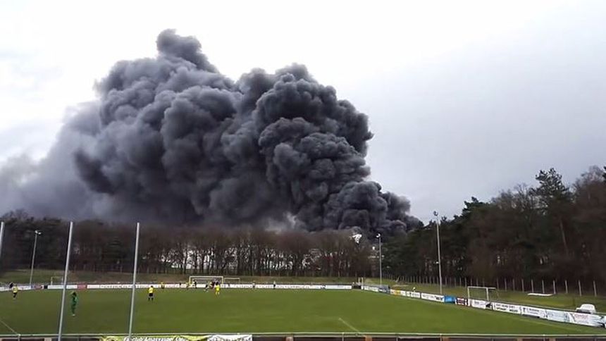 Un incendio se desató en un almacén de la compañía Wiesenhof, en Alemania, pero eso no fue motivo para que el partido entre el Amasya Lohne y el BW Lusche se detuviera.