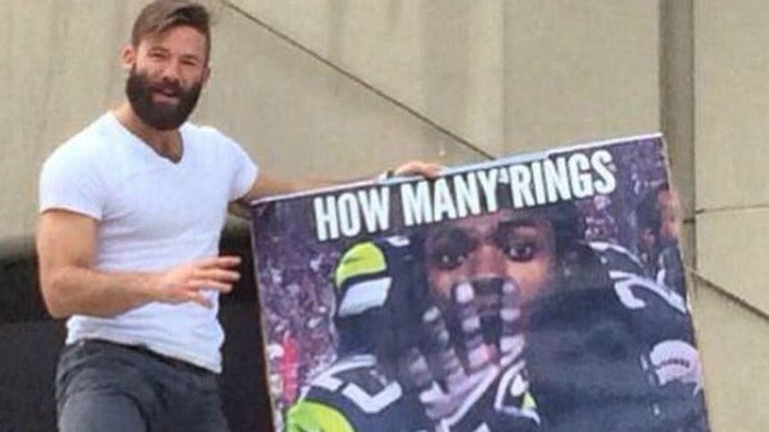 Julian Edelman, receptor de los Pats, mostró una pancarta con la imagen de Richard Sherman, esquinero de Seattle, quien está enseñando cuatro dedos y le agregaron la pregunta: ¿Cuántos anillos tiene Tom Brady?