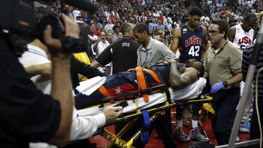 George se fracturó la pierna en el último parcial de un partido de fogueo entre jugadores de la preselección estadounidense el viernes por la noche. El alero saltó para intentar defender una bandeja de James Harden y su pierna se golpeó con la base del tablero.