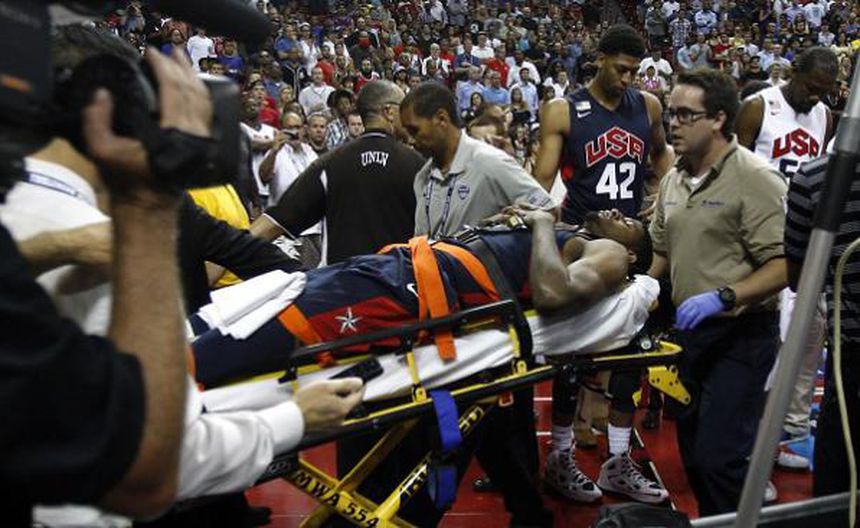 Los preparadores físicos de inmediato corrieron a atenderlo, y después de una pausa de unos 10 minutos, George fue sacado en camilla. Con los otros jugadores visiblemente afectados, el entrenador Mike Krzyzewski anunció al público que el fogueo había terminado, por respeto a George y su familia.