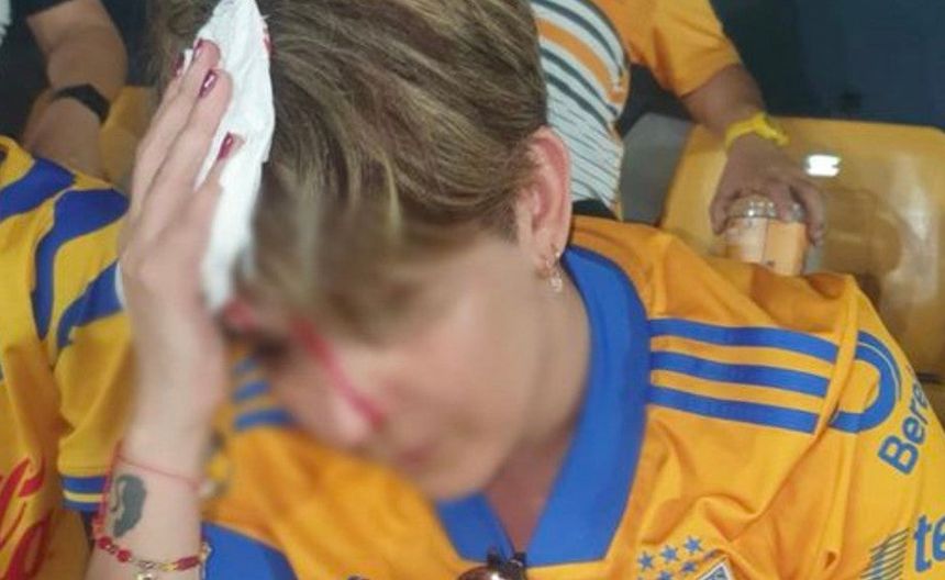 En la imagen se puede ver a la aficionada de Tigres sentada, sosteniendo el pedazo de concreto que la hirió, el cual estaba cubierto de sangre. A pesar de la situación, la afectada aparentaba estar tranquila mientras recibía atención, mientras el partido continuaba.