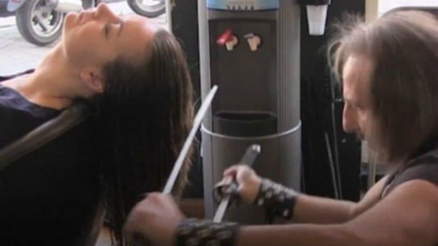 Un peluquero español, llamado Alberto Olmedo, decidió imitar al ‘joven manos de tijera’ y utiliza sables para cortar el cabello de sus clientes; por si fuera poco, también utiliza un soplete para crear nuevos atuendos.