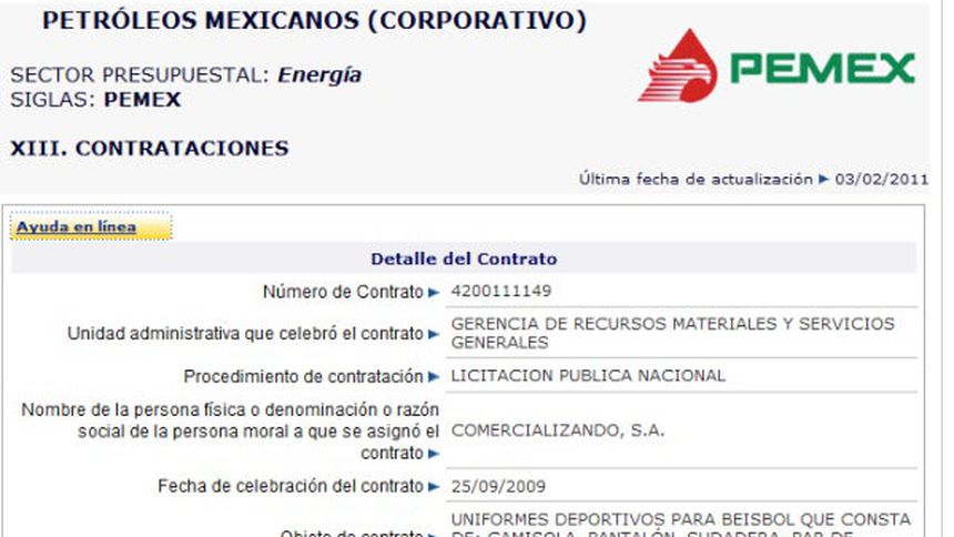 La información contenida en el contrato 4200111149, firmado el 25 de septiembre de 2009, señala que después de una licitación pública nacional, Pemex le otorgó a la empresa Comercializando, S.A el contrato para ser la proveedora de "UNIFORMES DEPORTIVOS PARA BEISBOL QUE CONSTA DE: CAMISOLA, PANTALÓN, SUDADERA, PAR DE MEDIAS Y GORRA” por un monto de 8 millones 888 mil 442 pesos.