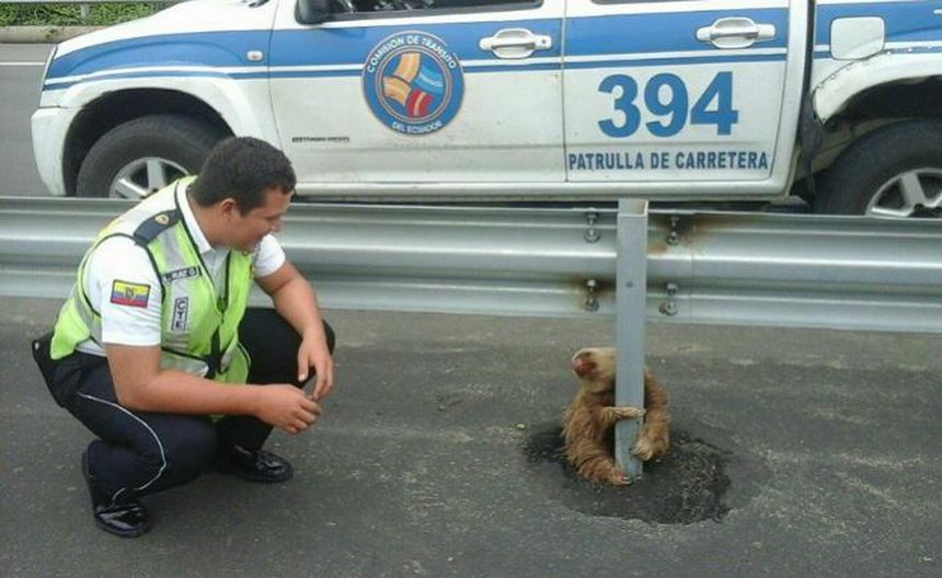 Un perezoso fue encontrado en medio de la carretera en Ecuador. La noticia se viralizó después de que la policía de tránsito del Ecuador subió las fotos a su página de Facebook.
