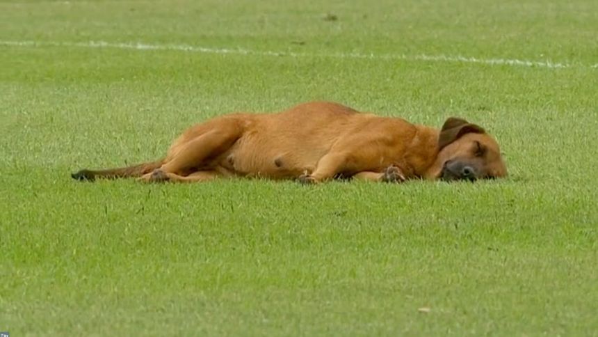 Perrito se queda dormido en el campo y atrasa un juego en Paraguay; se hace viral en redes sociales