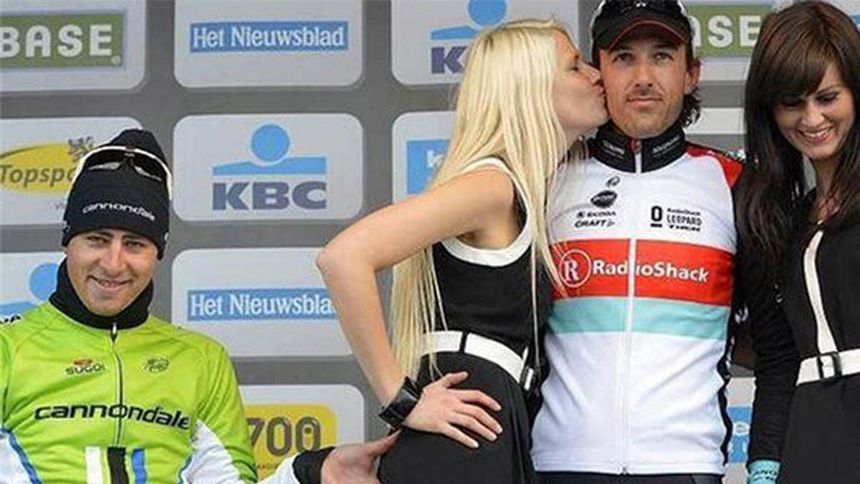 Mientras el ganador de la carrera, el suizo Fabian Cancellara, estaba acompañado por dos edecanes y recibía un beso de una de ellas, Sagan agarró con la mano izquierda el trasero de esta última.