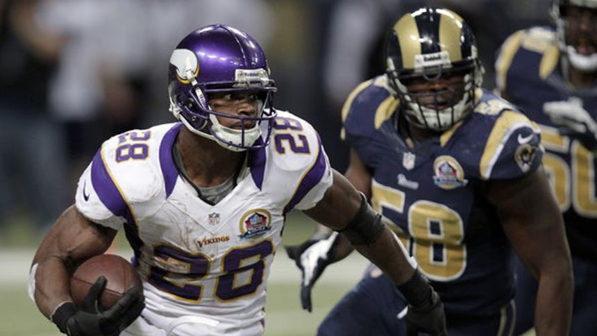 Adrian Peterson corrió para 212 yardas, su segunda mejor marca de la temporada, incluyendo un touchdown de 82 yardas que impulsó a los Vikingos de Minnesota en el segundo período y les dio la victoria el domingo por 36-22 sobre los Carneros de San Luis.