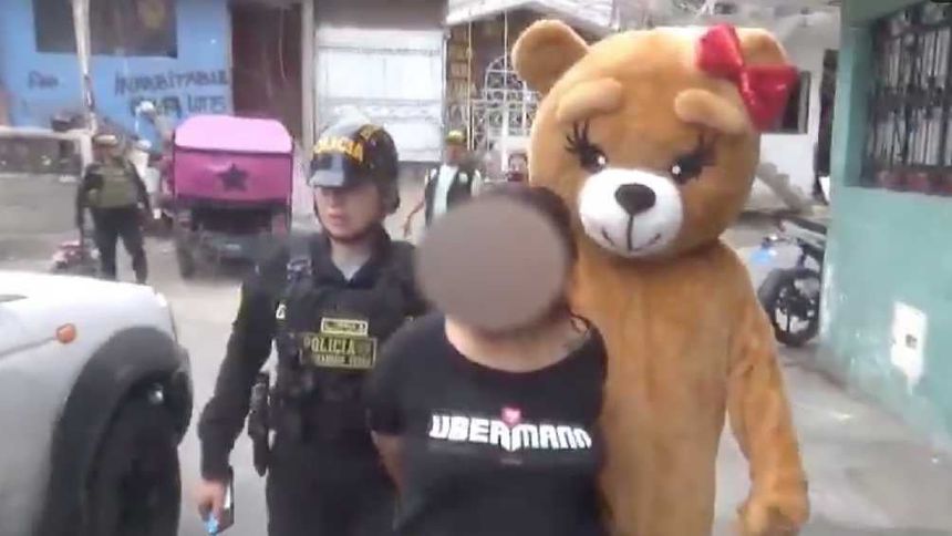 Con motivo del Día del Amor y la Amistad, un elemento de la Policía Nacional del Perú se disfrazó de un enorme oso de peluche para detener a un par de presuntas vendedoras de drogas.