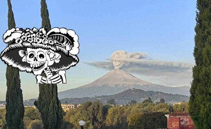 Popocatépetl exhaló fumarola con cara de la catrina
