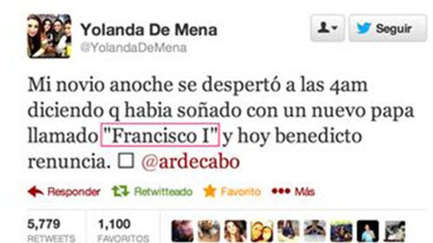 El 11 de febrero Yolanda publicó que su novio había soñado que el Papa Benedicto XVI renunciaría a su cargo y que su sucesor se llamaría Francisco I.