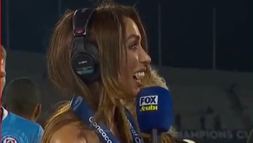 La presentadora alzó la mano mostrando los cinco dedos con la ‘manita’ (5 goles) orquestada por el conjunto cementero que sentenció con la conquista del título mientras realizaba una entrevista a un jugador del Cruz Azul.