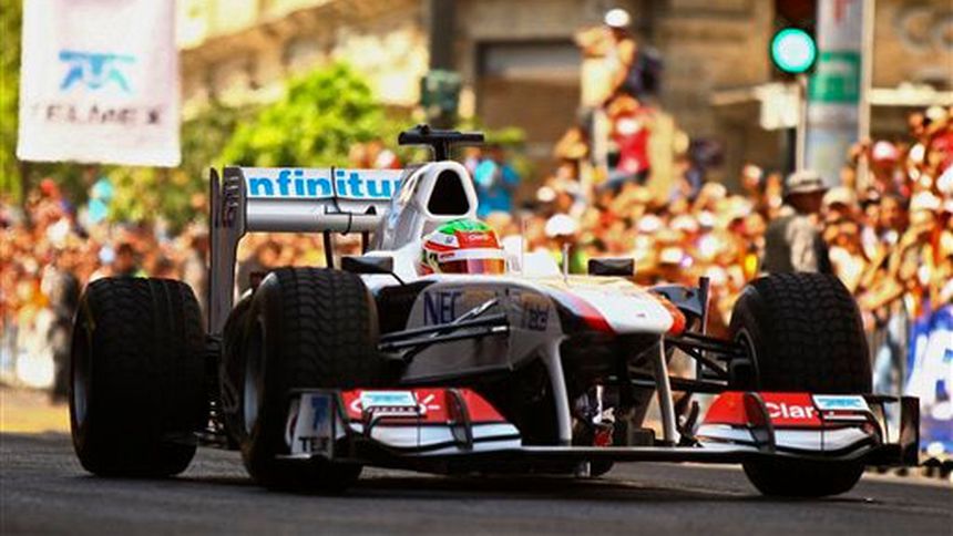 El piloto mexicano Sergio Pérez corrió el sábado con su monoplaza Sauber-Ferrari ante cientos de miles de personas en un circuito callejero en Guadalajara para exhibir en su tierra el bólido con que competirá en el campeonato mundial de Fórmula 1 que arranca en marzo en Australia.
