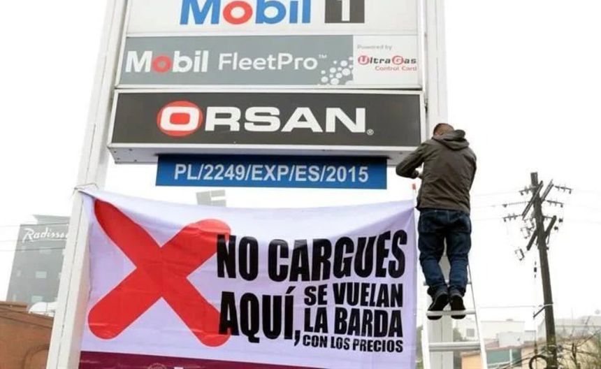 La gasolinera de la marca Mobil, ubicada en avenida Insurgentes 3991, colonia Colinas de San Jerónimo, en Monterrey, fue la primera en la que se instaló una de las grandes lonas.