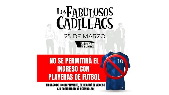A través de sus redes sociales oficiales, el Auditorio Telmex informó que estaría prohibido ingresar con playeras de equipos de futbol al espectáculo programado para el 25 de marzo a las 21:00 horas. La publicación generó reacciones inmediatas entre los fans.