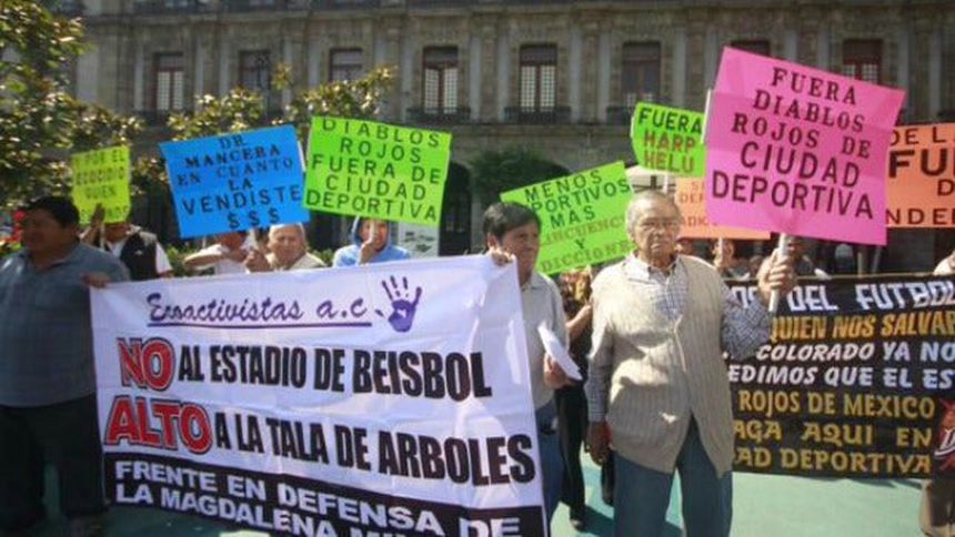 La construcción del nuevo estadio de los Diablos Rojos del México en la Ciudad Deportiva de la Magdalena Mixhuca provocó molestias, por lo que miembros del Frente en Defensa de esta colonia protestaron en el Zócalo.