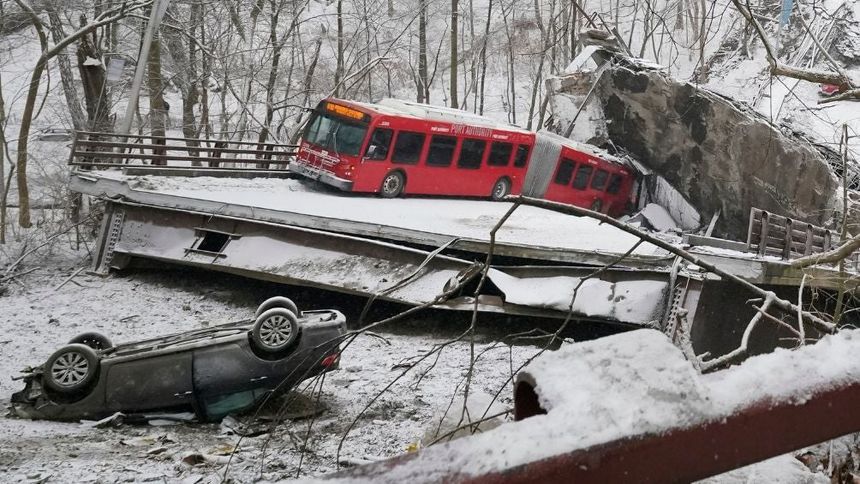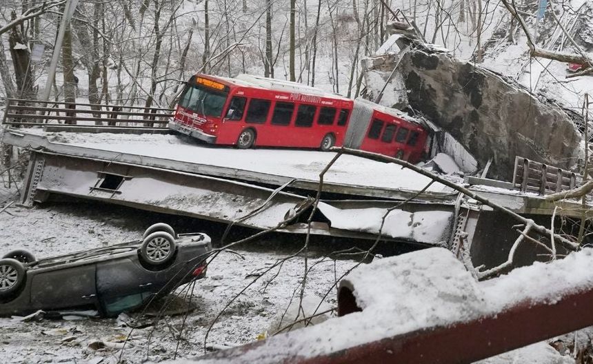 Un puente construido hace 50 años en Pittsburgh colapsó el viernes, y los rescatistas tuvieron que bajar por un barranco en rappel y formar cadenas humanas para ayudar a varios pasajeros de un autobús municipal que se desplomó junto con el tramo. No se informó de ninguna muerte.