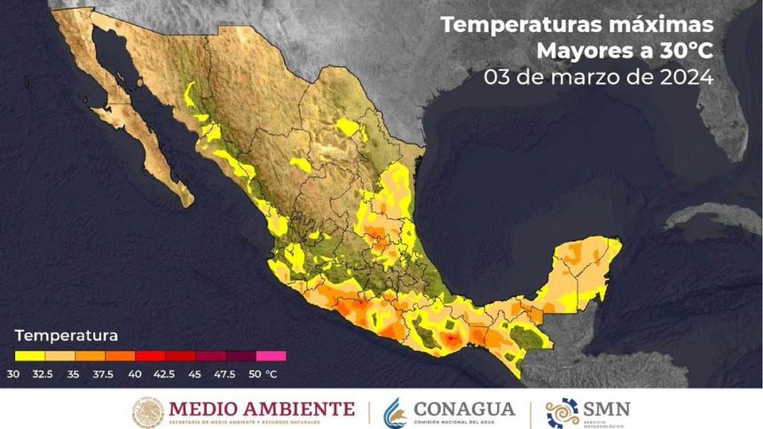 La CONAGUA (Comisión Nacional del Agua) informó que, para este domingo, los estados de Nayarit, Michoacán, Guerrero y Morelos serán los que tengan las temperaturas más altas, ya que se pronostica que estén entre 40 y 45 grados.