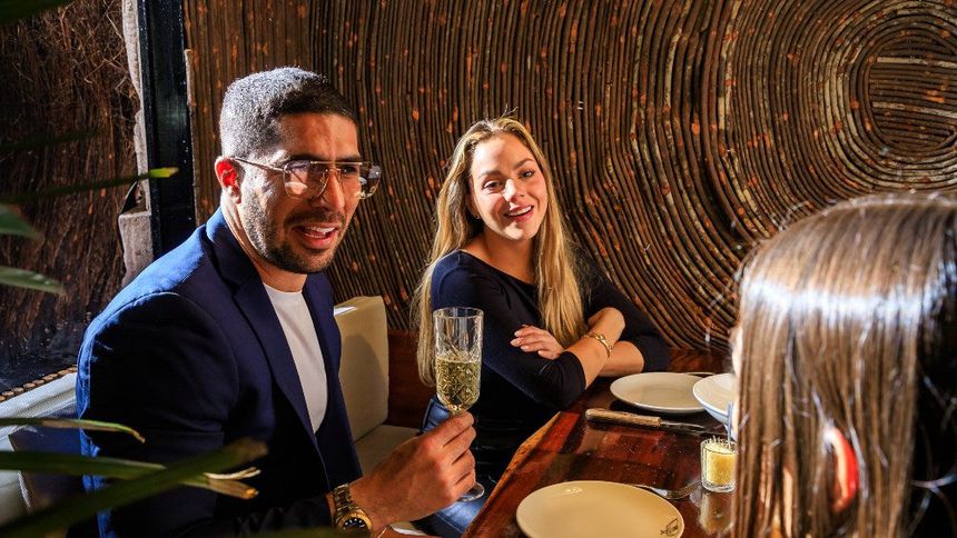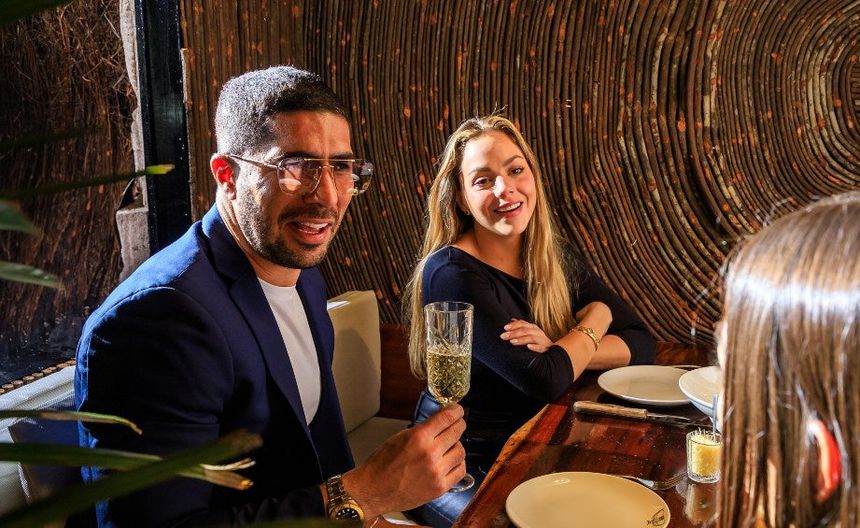 Pereira modeló y salió un cara sonriente acompañado de un sobrio look en las fotos que se pueden apreciar, acompañado también por dos mujeres que degustan del vino.