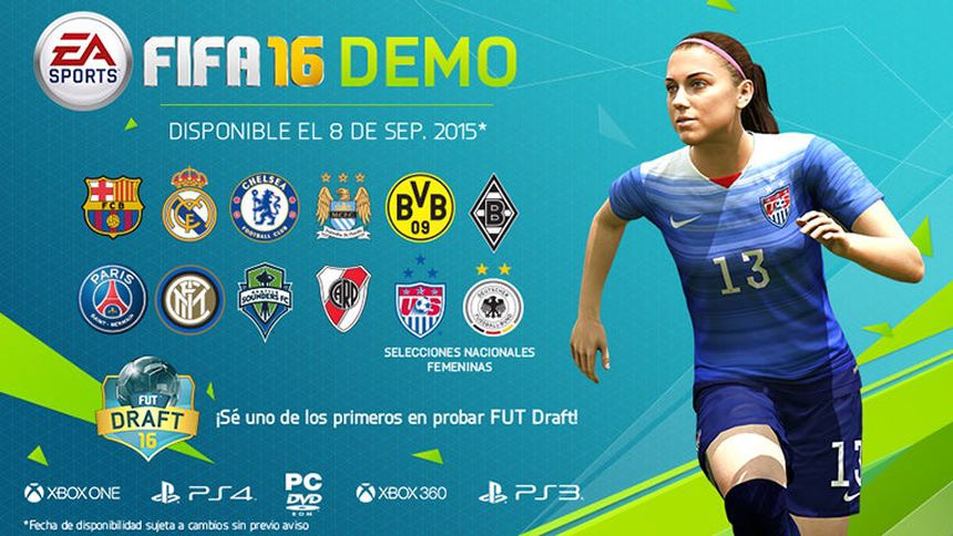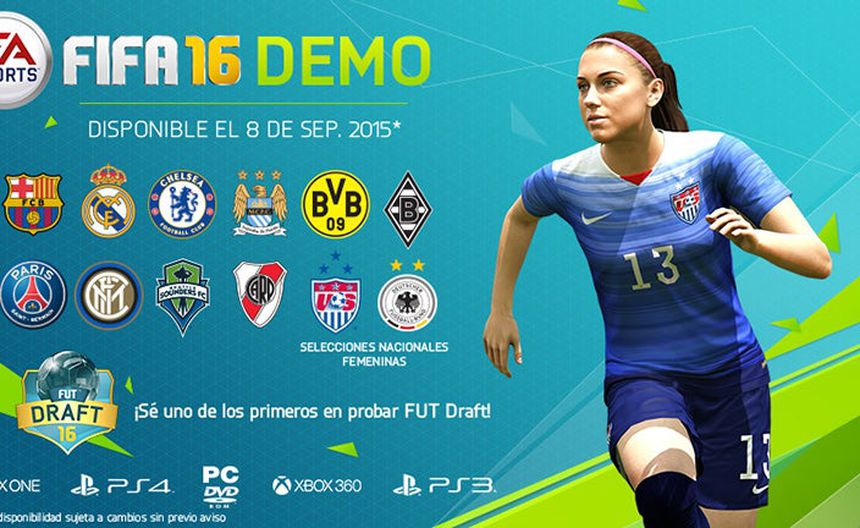 FIFA 16 verá la luz en México el próximo 22 de septiembre; sin embargo, el próximo día 8 podremos disfrutar de un adelanto de la versión final, misma que contará con 12 equipos, Barcelona, Borussia Dortmund, Borussia Mönchengladbach, Chelsea, Inter Milan, Manchester City, Paris Saint-Germain, Real Madrid, River Plate, Seattle Sounders y dos selectivos femeniles: Estados Unidos y Alemania.