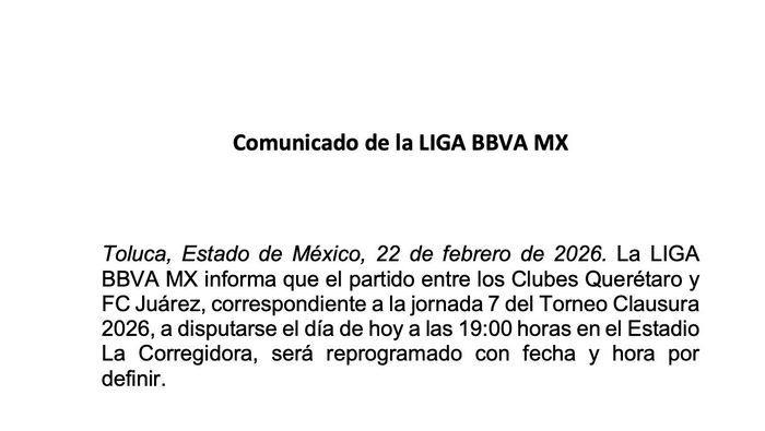 A través de un comunicado oficial, la liga confirmó que el partido entre Querétaro y Juárez FC, programado para cerrar la Jornada 7 del Torneo Clausura 2026, no se jugará este domingo 22 de febrero.
