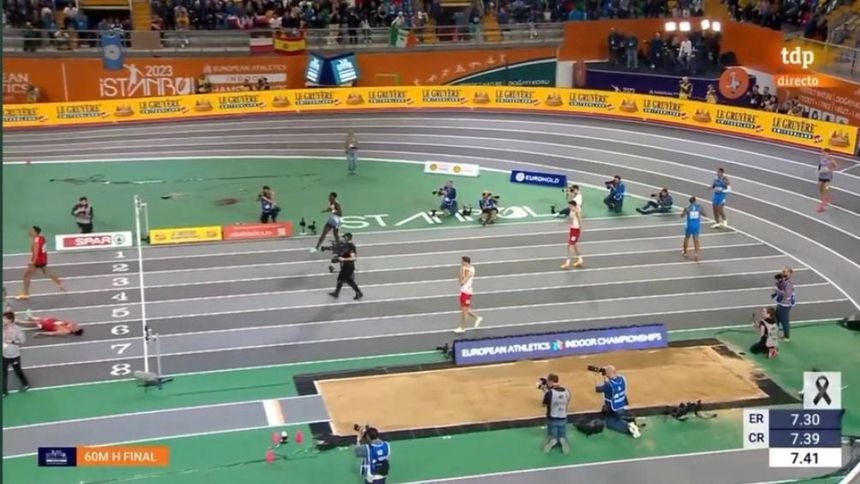 El corredor español Quique Llopis sufrió una dura caída durante la Final del 60 metros vallas del campeonato europeo, en donde el ganador fue el suizo Jason Joseph.