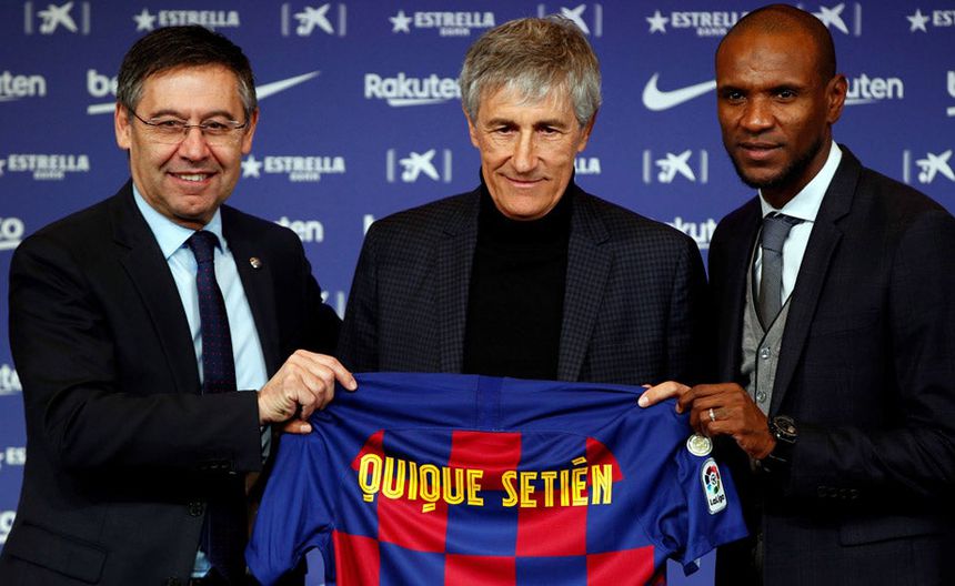 Quique Setién posa con Bartomeu y Abidal | EFE