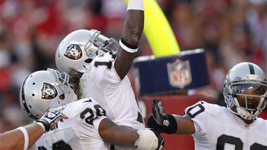 Darren McFadden corrió 114 yardas, y Denarius Moore y Darrius Heyward-Bey tuvieron atrapadas de anotación para Oakland, quien ha ganado dos consecutivos tras perder cuatro de sus cinco primeros juegos.