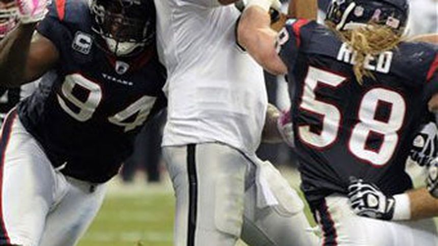 Michael Huff interceptó un pase de Matt Schaub en la zona de anotación en la última jugada para asegurar el triunfo.