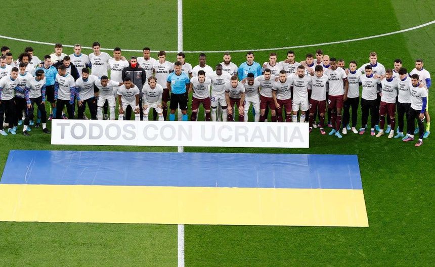 En el previo del partido que enfrenta al Real Madrid con la Real Sociedad en el Santiago Bernabéu, ambos conjuntos mostraron su apoyo a Ucrania con una lona gigante en la lateral oeste con el mensaje “Todos Con Ucrania” y el guardameta ucraniano Andriy Lunun recibió cariño de su afición.