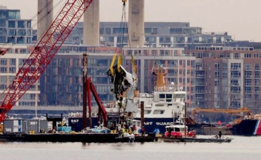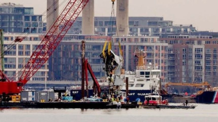Horas antes, los equipos de recuperación que trabajaban en aguas agitadas sacaron del río Potomac algunos fragmentos de gran tamaño del avión, incluida el ala derecha, el fuselaje central y partes de la cabina delantera, la cabina de mando, el cono de cola y el timón.